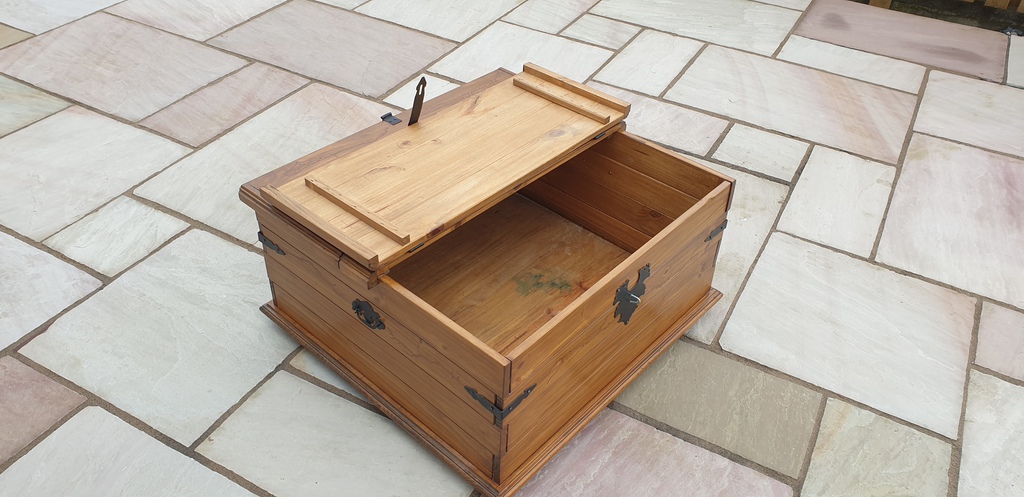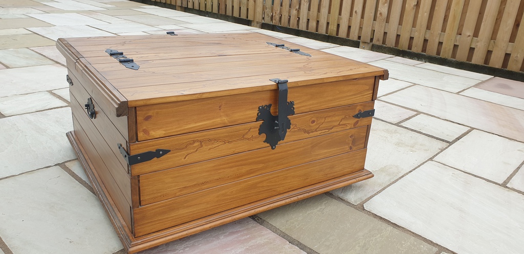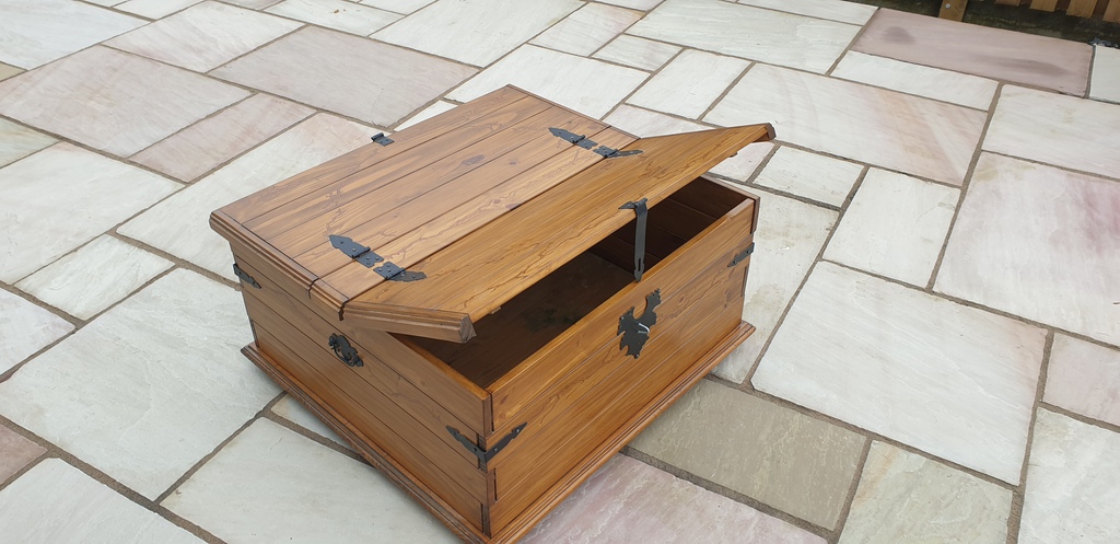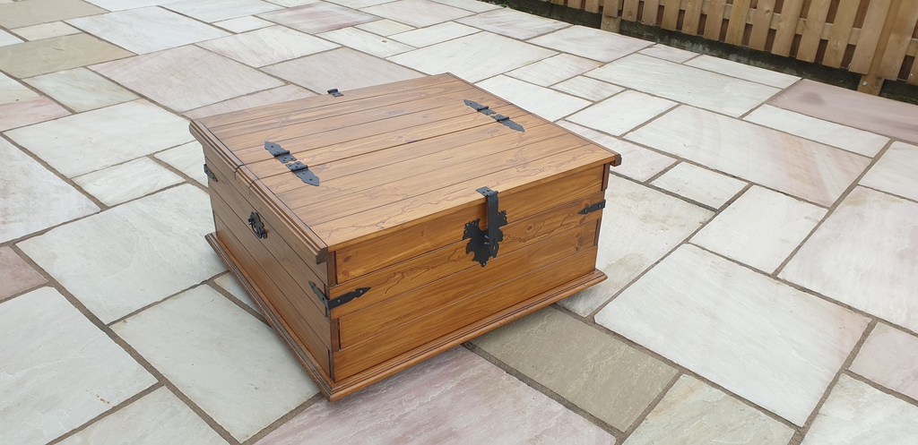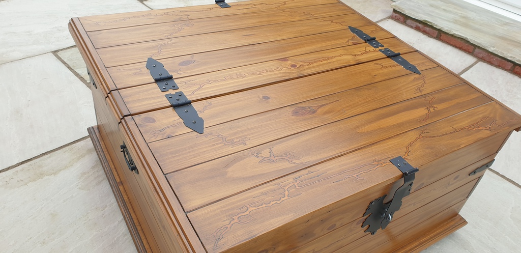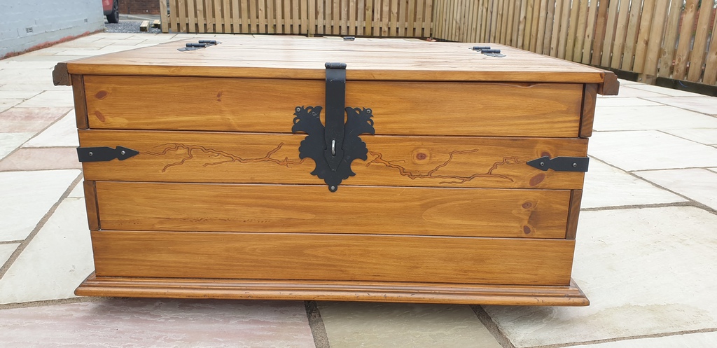A large and very robust chest, ideal for use as a living room coffee table with plenty of storage space inside. Lichtenberg figures across every surface, inlaid with gold resin and finished with black metal furniture that also provides the option to lock either side closed if desired (Locks not supplied). Free delivery throughout South Wales.