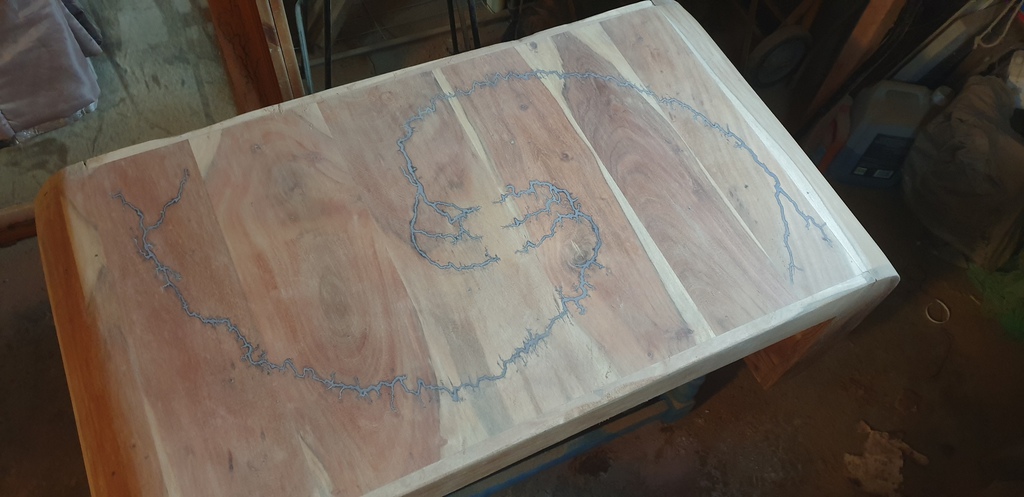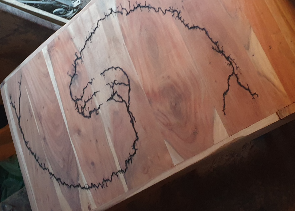 A very heavy coffee table, Lichtenberg figures across the top surface in spiral designs, inlaid with a blue/purple UV activated resin that provides a soft glow under the right lighting conditions. PLEASE NOTE, photos below are mid-production (blue legs in images are workstands, not part of table), final photos will be added soon. Free delivery throughout South Wales.