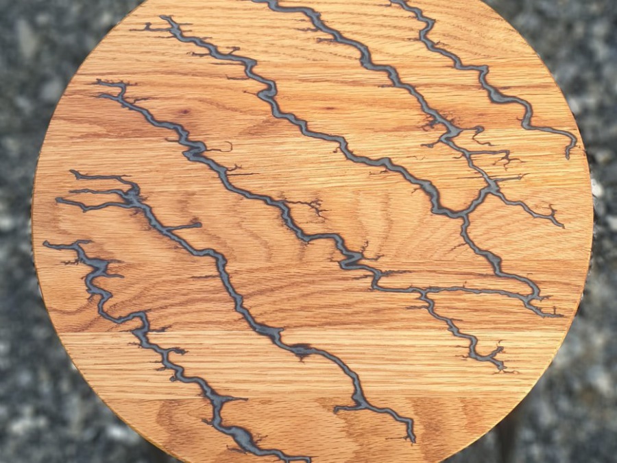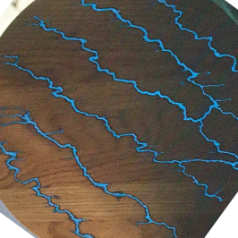 By introducing an extremely high voltage electrical current to wooden surfaces, unique designs can be created through a fascinating process that causes the fibres in the wood to heat up, scorching deep veins into the material through a combination of human input and the natural structure of the wood, ensuring every design is 100% unique.
